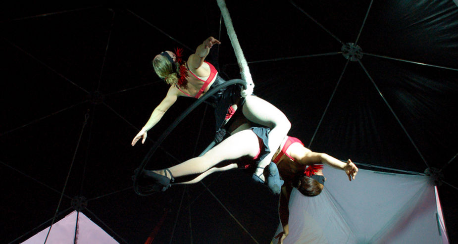 This already visually pleasing aerial equipment becomes even more mesmerising with two female artists synchronized moves as their bodies mould around and through this perfect circle spinning in the air.